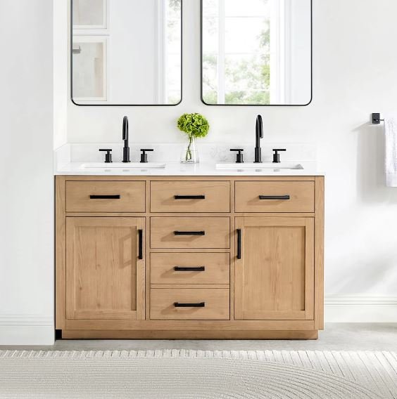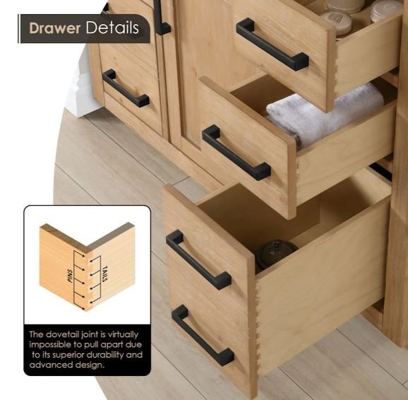 Description: Instantly enhance the aesthetic of your bathroom space with this Cerrito Bathroom Vanity, a fusion of contemporary elegance and natural charm. Crafted from premium spruce wood, this vanity features beautifully fluted doors that showcase the natural wood grain and sleek grain countertop. Protect your walls in style with the optional 4-inch backsplash and side-splash. The Cerrito is the perfect blend of on-trend design and everyday practicality, with soft-closing doors and drawers that keep all your essentials neatly organized and tucked away.